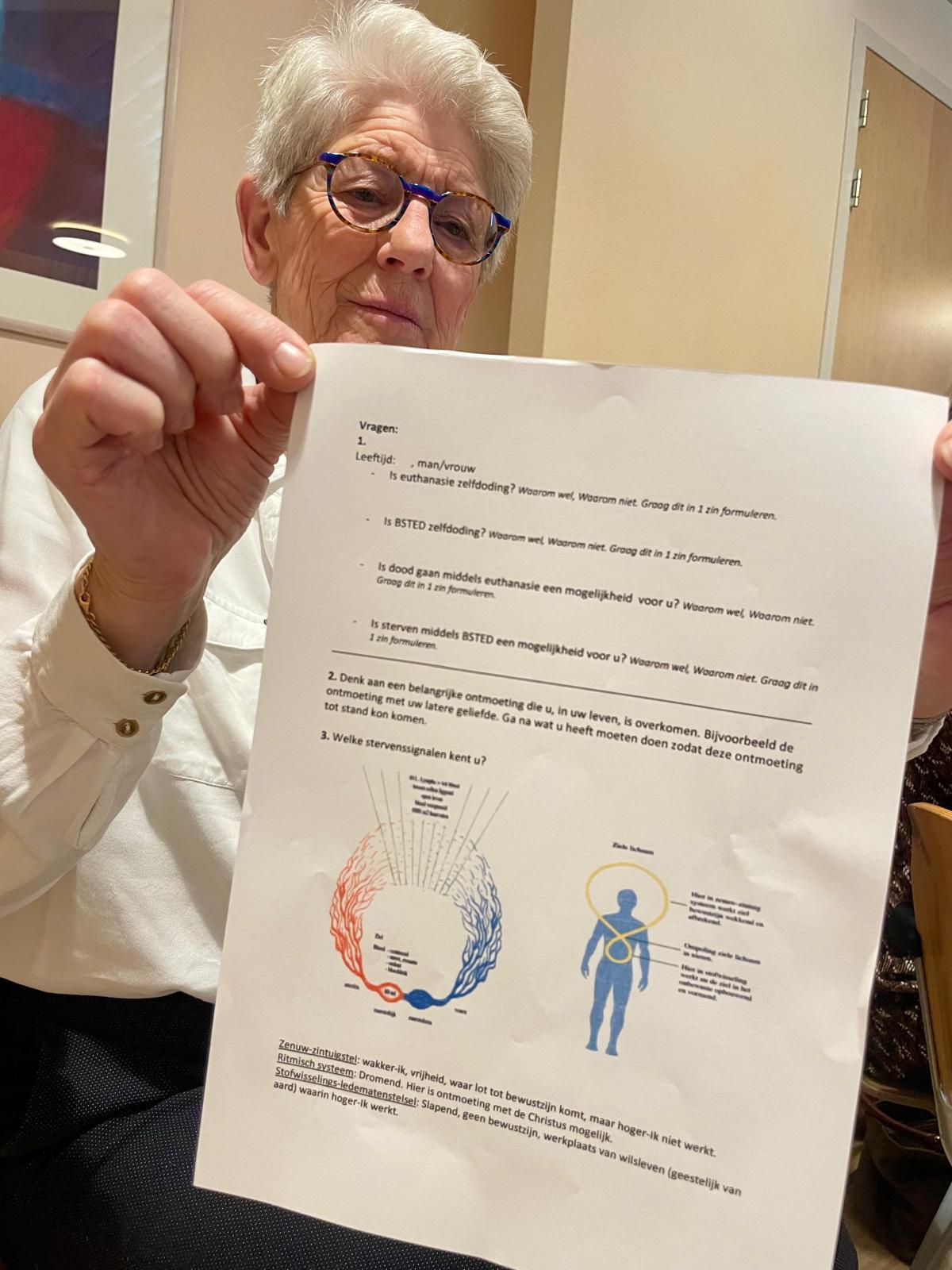 Niet alleen ouderen kwamen hier op af. Het is dan ook een onderwerp dat ons uiteindelijk allemaal aangaat. Op uitdrukkelijk verzoek van de spreker had de lezing tevens het karakter van een werkgroep. We werden in tweetallen op pad gestuurd met vragen als: is euthanasie zelfdoding? Waarom wel, of waarom niet? Geldt hetzelfde ook voor Bewust Stoppen met Eten en Drinken? En zou doodgaan door euthanasie, of sterven door BSTED voor ons een mogelijkheid kunnen zijn? Hiermee lagen direct alle gevoelens, gedachten en dilemma’s rond dit thema op tafel.
